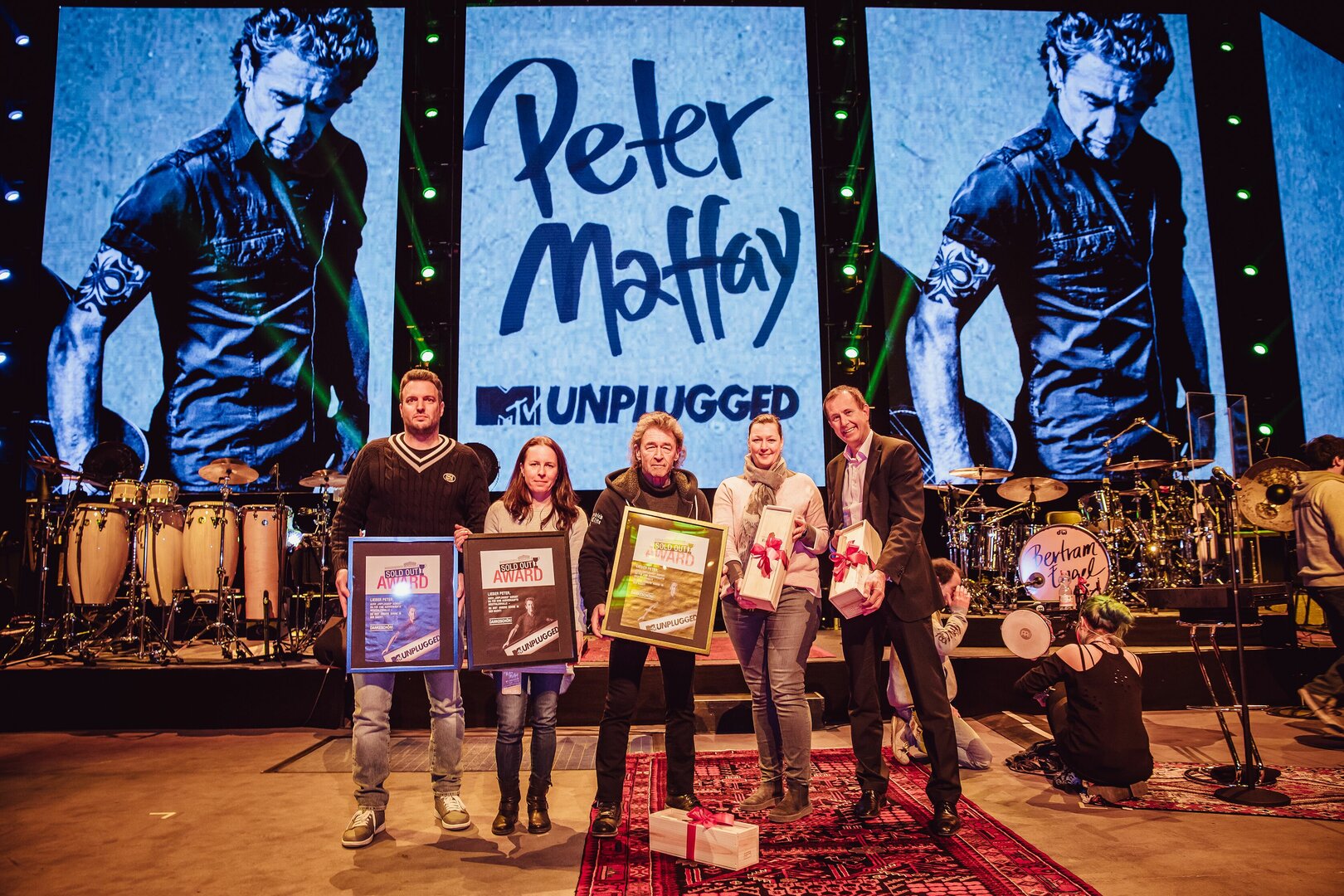 Die Westfalenhalle ist für Peter Maffay nicht irgendeine Halle. „Sie war 1970 die erste große Arena, in der ich ‚Du‘ gesungen habe“, erinnerte er sich am 28. Februar während seines Auftritts im Rahmen der MTV-Uplugged-Tour. In dieser Arena, an der für ihn so viele Erinnerungen hängen, ist der Sänger bis heute enorm erfolgreich. Am 28. Februar verkaufte er die Westfalenhalle erneut aus. Als Dankeschön für die lange und sehr gute Zusammenarbeit überreichten Jochen Meschke, Geschäftsführer der Veranstaltungszentrum Westfalenhallen GmbH (r.), und Gabi Staszak vom Veranstaltungszentrum (2.v.r.) dem Künstler und den Veranstaltern der MTV-Unplugged-Tour je einen Sold-out-Award und ein Geschenk. Links im Bild: Fabian Schulte Terboven, RTK Roland Temme Konzertveranstaltungsgesellschaft, und Sötje Förtsch, Dirk Becker Entertainment.