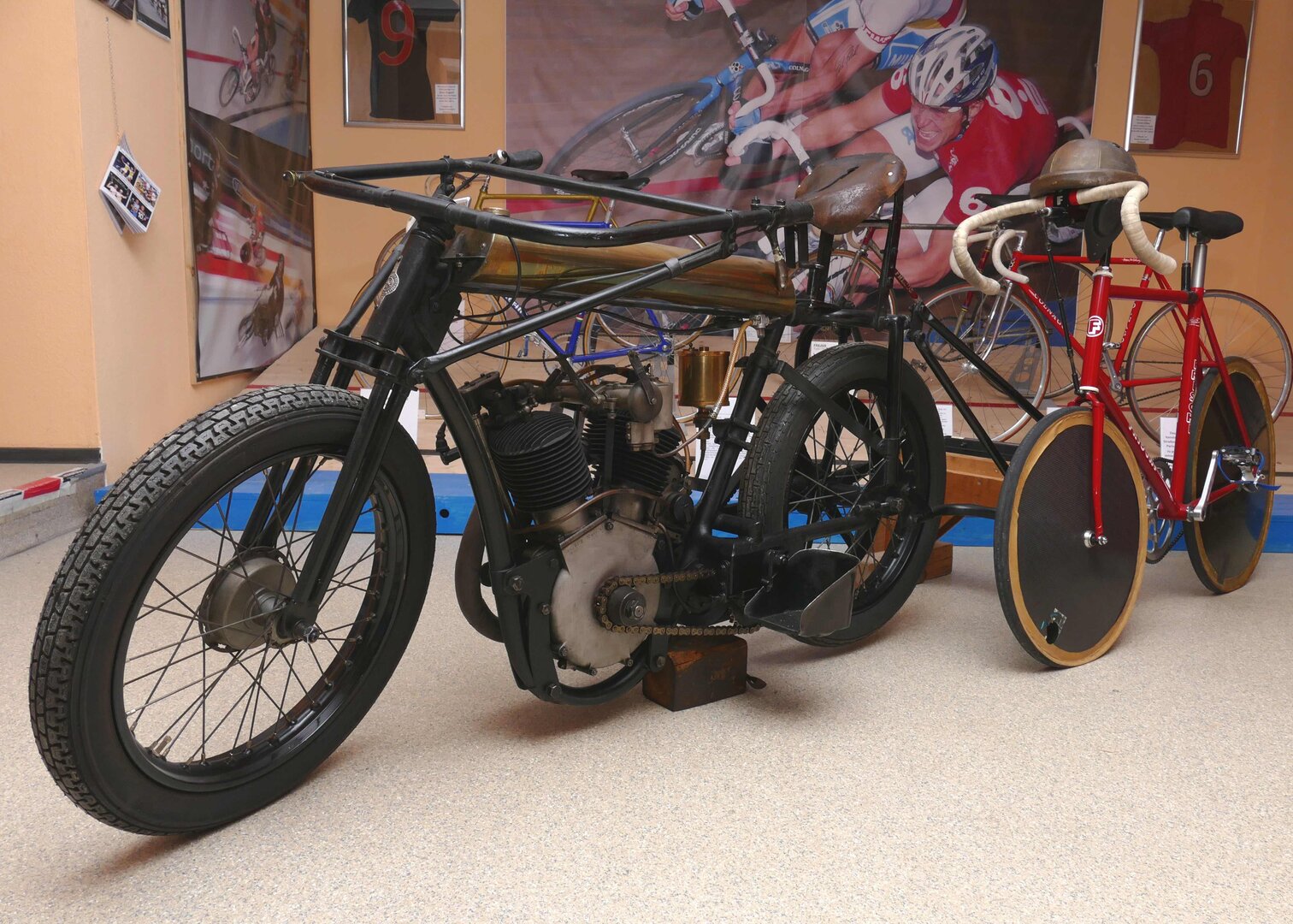 Das Stehermotorrad der Westfalenhallen Unternehmensgruppe ist nun ausgestellt zusammen mit einem Steher-Rennrad eines ehemaligen Weltmeisters: Radrennfahrer Roland Günther. Aufgebaut ist sie – zusammen unter anderem mit einer Original-Lederkluft wie sie die Schrittmacher damals trugen – vor der authentischen Kulisse einer nachgebauten Radrennbahn.