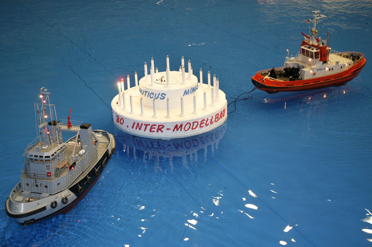 2008: Die INTERMODELLBAU wird 30 und bekommt eine schwimmende Torte vom nauticus e.V., deutscher Dachverband für Schiffsmodellbau und Schiffsmodellsport